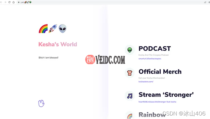 据Opera介绍,Yat最早一批的使用者是音乐家。例如,歌手Kesha的Yat页面y.at/🌈🚀👽是表情符号 Rainbow Rocket Alien,前面的y.at就重定向到了她的Kesha’s World网站。