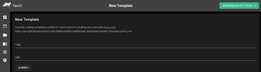 现在,通过选择左侧边栏上的模板创建您的第一个模板,输入应用程序标题和 URL。 要使用默认模板,请复制列出的 Yacht Github URL,然后单击提交以创建模板。