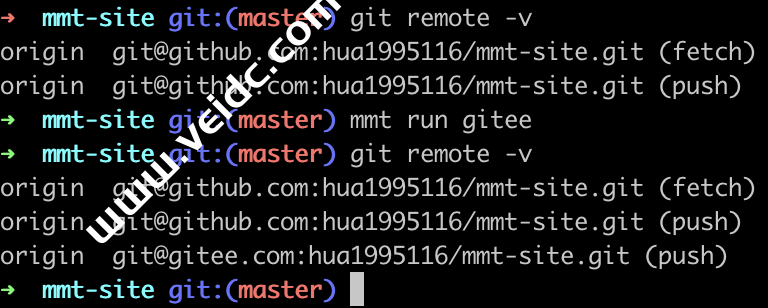 npm i -g mmt mmt import https://gitee.com/hua1995116/mmt-practices/raw/master/mmt-export-gitee.json // 进入到你想要添加命令的目录 mmt run gitee // 每个原有 github 仓库无脑运行这个命令就可以