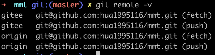 git remote add <name> <url>git remote add gitee ``[git@github.com](mailto:git@github.com "git@github.com")``:hua1995116/mmt.git