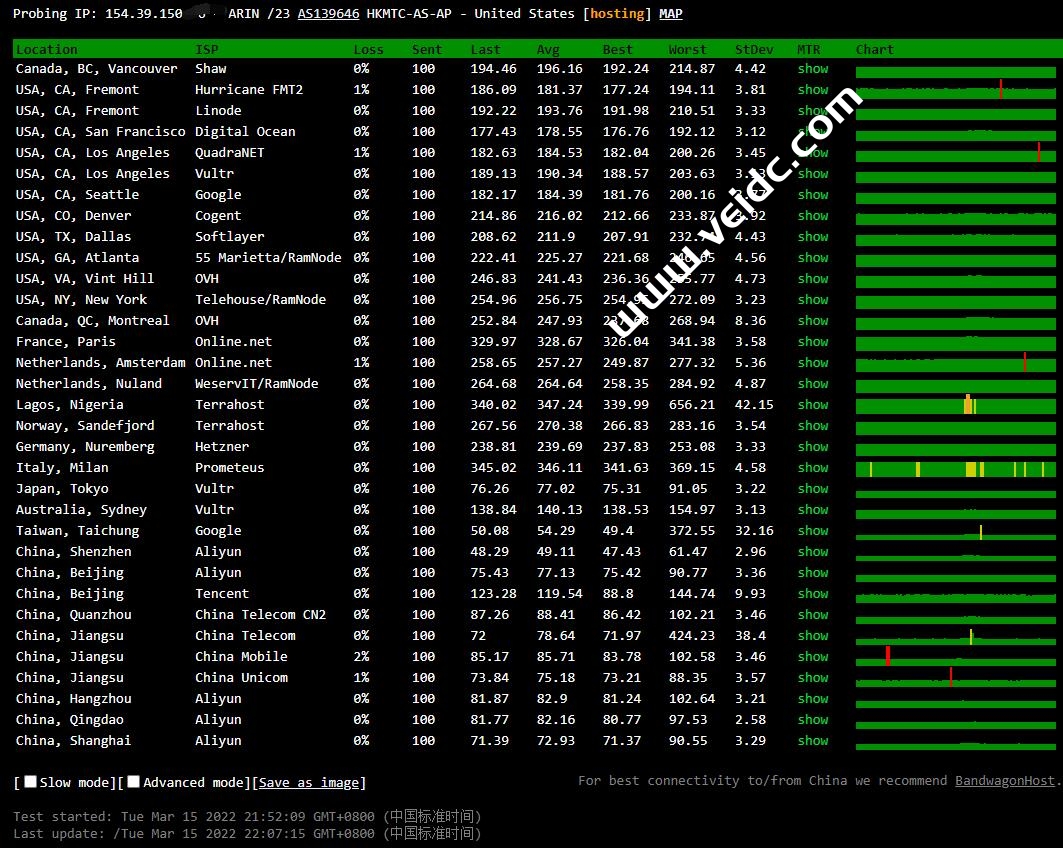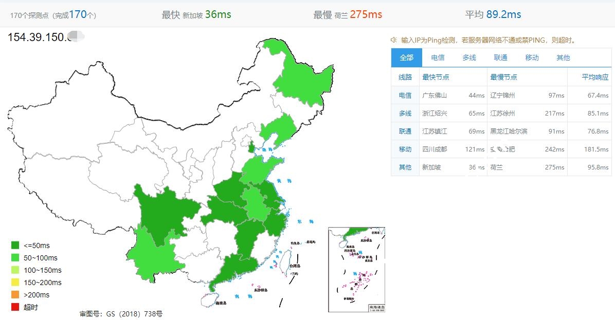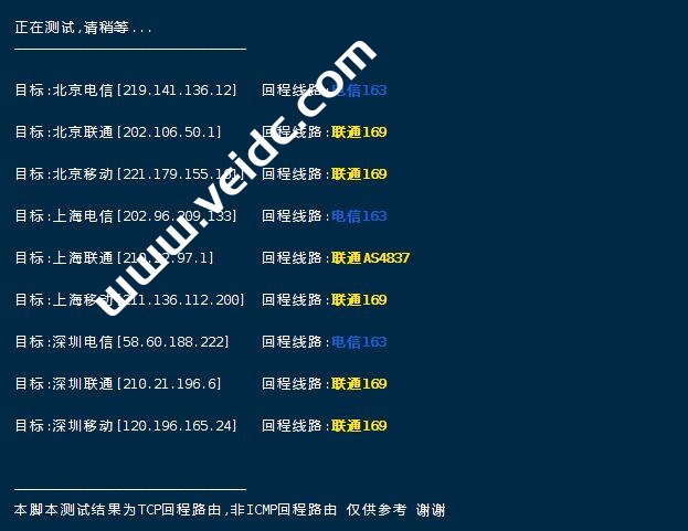 [Info] 测试路由 到 上海电信(天翼云) 中 ... traceroute to 101.227.255.45 (101.227.255.45), 30 hops max, 32 byte packets 1 154.39.150.254 103.56 ms AS139646 新加坡, cogentco.com 2 10.249.0.5 1.25 ms * 局域网 3 43.252.87.205 1.74 ms AS10099 新加坡, chinaunicom.com, 联通 4 202.77.23.241 37.72 ms AS10099 中国, 香港, chinaunicom.com, 联通 5 202.77.23.157 37.38 ms AS10099 中国, 香港, chinaunicom.com, 联通 6 218.105.11.85 43.08 ms AS9929 中国, 广东, 广州, chinaunicom.com, 联通 7 218.105.2.109 43.28 ms AS9929 中国, 广东, 广州, chinaunicom.com, 联通 8 218.105.131.182 67.69 ms AS9929 中国, 上海, chinaunicom.com, 联通 9 218.105.2.150 69.03 ms AS9929 中国, 上海, chinaunicom.com, 联通 10 202.97.16.65 73.32 ms AS4134 中国, 上海, chinatelecom.com.cn, 电信 11 * 12 61.152.25.197 69.14 ms AS4812 中国, 上海, chinatelecom.com.cn, 电信 13 * 14 * 15 * 16 * 17 * 18 * 19 * 20 * 21 * 22 * 23 * 24 * 25 * 26 * 27 * 28 * 29 * 30 * [Info] 测试路由 到 上海电信(天翼云) 完成 ! [Info] 测试路由 到 厦门电信CN2 中 ... traceroute to 117.28.254.129 (117.28.254.129), 30 hops max, 32 byte packets 1 154.39.150.254 7.23 ms AS139646 新加坡, cogentco.com 2 10.249.0.5 1.48 ms * 局域网 3 43.252.87.205 1.84 ms AS10099 新加坡, chinaunicom.com, 联通 4 202.77.23.241 37.80 ms AS10099 中国, 香港, chinaunicom.com, 联通 5 202.77.23.157 37.11 ms AS10099 中国, 香港, chinaunicom.com, 联通 6 218.105.7.217 45.99 ms AS9929 中国, 广东, 广州, chinaunicom.com, 联通 7 218.105.2.157 44.02 ms AS9929 中国, 广东, 广州, chinaunicom.com, 联通 8 218.105.131.121 76.05 ms AS9929 中国, 北京, chinaunicom.com, 联通 9 210.78.30.142 75.46 ms * 中国, chinaunicom.com, 联通 10 219.158.39.69 79.47 ms AS4837 中国, 北京, chinaunicom.com, 联通 11 * 12 219.158.5.130 80.56 ms AS4837 中国, 北京, chinaunicom.com, 联通 13 219.158.40.166 75.08 ms AS4837 中国, 北京, chinaunicom.com, 联通 14 59.43.140.82 77.42 ms * 中国, 北京, chinatelecom.com.cn, 电信 15 59.43.142.234 77.71 ms * 中国, 广东, 广州, chinatelecom.com.cn, 电信 16 59.43.140.34 91.86 ms * 中国, 福建, chinatelecom.com.cn, 电信 17 * 18 * 19 117.25.141.110 91.89 ms AS133775 中国, 福建, 厦门, chinatelecom.com.cn, 电信 20 117.28.254.129 91.01 ms AS4809 中国, 福建, 厦门, chinatelecom.com.cn, 电信 [Info] 测试路由 到 厦门电信CN2 完成 ! [Info] 测试路由 到 浙江杭州联通 中 ... traceroute to 101.71.241.238 (101.71.241.238), 30 hops max, 32 byte packets 1 154.39.150.254 1.91 ms AS139646 新加坡, cogentco.com 2 10.249.0.5 1.42 ms * 局域网 3 43.252.87.205 3.63 ms AS10099 新加坡, chinaunicom.com, 联通 4 202.77.23.241 37.45 ms AS10099 中国, 香港, chinaunicom.com, 联通 5 202.77.23.157 37.24 ms AS10099 中国, 香港, chinaunicom.com, 联通 6 218.105.7.213 41.24 ms AS9929 中国, 广东, 广州, chinaunicom.com, 联通 7 218.105.2.129 42.29 ms AS9929 中国, 广东, 广州, chinaunicom.com, 联通 8 218.105.131.198 68.33 ms AS9929 中国, 上海, chinaunicom.com, 联通 9 218.105.2.174 68.60 ms AS9929 中国, 上海, chinaunicom.com, 联通 10 219.158.44.205 70.68 ms AS4837 中国, 上海, chinaunicom.com, 联通 11 219.158.113.197 70.29 ms AS4837 中国, 上海, chinaunicom.com, 联通 12 219.158.106.122 75.31 ms AS4837 中国, 浙江, 杭州, chinaunicom.com, 联通 13 * 14 * 15 * 16 * 17 * 18 * 19 * 20 * 21 * 22 * 23 * 24 * 25 * 26 * 27 * 28 * 29 * 30 * [Info] 测试路由 到 浙江杭州联通 完成 ! [Info] 测试路由 到 浙江杭州移动 中 ... traceroute to 112.17.0.106 (112.17.0.106), 30 hops max, 32 byte packets 1 154.39.150.254 7.75 ms AS139646 新加坡, cogentco.com 2 10.249.0.5 1.61 ms * 局域网 3 43.252.87.205 1.80 ms AS10099 新加坡, chinaunicom.com, 联通 4 61.14.201.109 43.47 ms * 中国, 香港, chinaunicom.com, 联通 5 202.77.23.157 36.81 ms AS10099 中国, 香港, chinaunicom.com, 联通 6 218.105.10.125 42.48 ms AS9929 中国, 广东, chinaunicom.com, 联通 7 218.105.2.133 41.03 ms AS9929 中国, 广东, 广州, chinaunicom.com, 联通 8 218.105.131.198 68.15 ms AS9929 中国, 上海, chinaunicom.com, 联通 9 218.105.2.174 68.51 ms AS9929 中国, 上海, chinaunicom.com, 联通 10 219.158.113.149 71.49 ms AS4837 中国, 上海, chinaunicom.com, 联通 11 * 12 * 13 219.158.112.102 80.60 ms AS4837 中国, 浙江, 杭州, chinaunicom.com, 联通 14 * 15 221.183.95.121 95.30 ms AS9808 中国, 浙江, 杭州, chinamobile.com, 移动 16 * 17 * 18 * 19 * 20 * 21 * 22 * 23 * 24 * 25 * 26 * 27 * 28 * 29 * 30 * [Info] 测试路由 到 浙江杭州移动 完成 ! [Info] 测试路由 到 北京教育网 中 ... traceroute to 202.205.6.30 (202.205.6.30), 30 hops max, 32 byte packets 1 154.39.150.254 3.25 ms AS139646 新加坡, cogentco.com 2 10.249.0.5 1.30 ms * 局域网 3 43.252.87.205 1.75 ms AS10099 新加坡, chinaunicom.com, 联通 4 202.77.23.241 36.59 ms AS10099 中国, 香港, chinaunicom.com, 联通 5 202.77.23.157 37.09 ms AS10099 中国, 香港, chinaunicom.com, 联通 6 218.105.11.85 41.51 ms AS9929 中国, 广东, 广州, chinaunicom.com, 联通 7 218.105.2.133 41.57 ms AS9929 中国, 广东, 广州, chinaunicom.com, 联通 8 218.105.131.198 68.50 ms AS9929 中国, 上海, chinaunicom.com, 联通 9 218.105.2.174 68.80 ms AS9929 中国, 上海, chinaunicom.com, 联通 10 219.158.113.149 71.21 ms AS4837 中国, 上海, chinaunicom.com, 联通 11 219.158.113.197 70.32 ms AS4837 中国, 上海, chinaunicom.com, 联通 12 219.158.101.30 70.15 ms AS4837 中国, 上海, chinaunicom.com, 联通 13 211.102.30.15 85.03 ms * 中国, 上海, 电信/教育网/联通 14 101.4.117.229 119.36 ms AS4538 中国, 上海, edu.cn, 教育网 15 101.4.118.114 86.71 ms AS4538 中国, 上海, edu.cn, 教育网 16 101.4.118.197 86.19 ms AS4538 中国, 北京, edu.cn, 教育网 17 101.4.113.110 82.56 ms AS4538 中国, 北京, edu.cn, 教育网 18 219.224.102.230 108.22 ms AS4538 中国, 