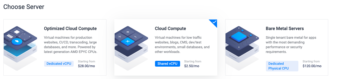Vultr云计算平台也进行了一些更新,主要有优化的云计算(Optimized Cloud Compute)、云计算(Cloud Compute)、裸金属服务器(Bare Metal Servers)等系列产品。