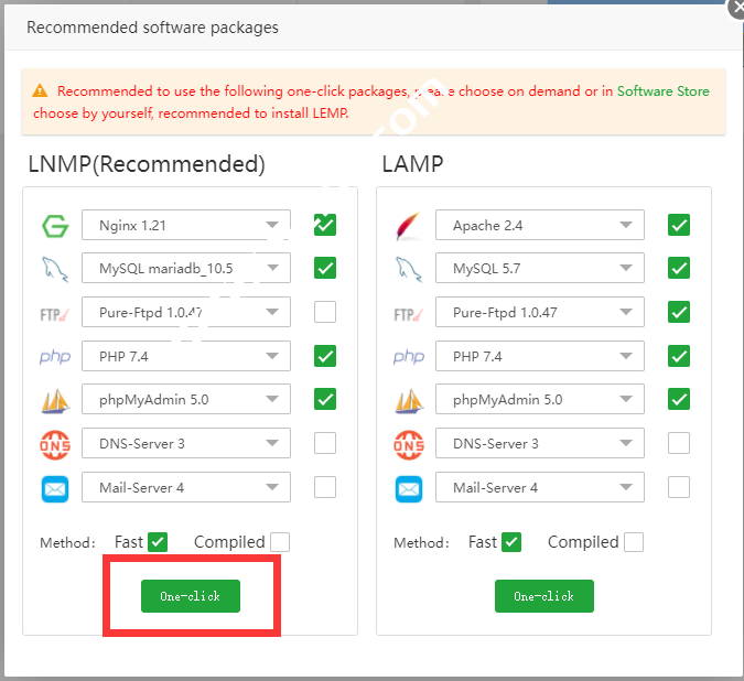 您将需要在服务器上安装 Web 堆栈。LEMP 和 LAMP 堆栈都将显示在弹出窗口中。选择您的最佳选择,下面我们将安装 LEMP 堆栈。
