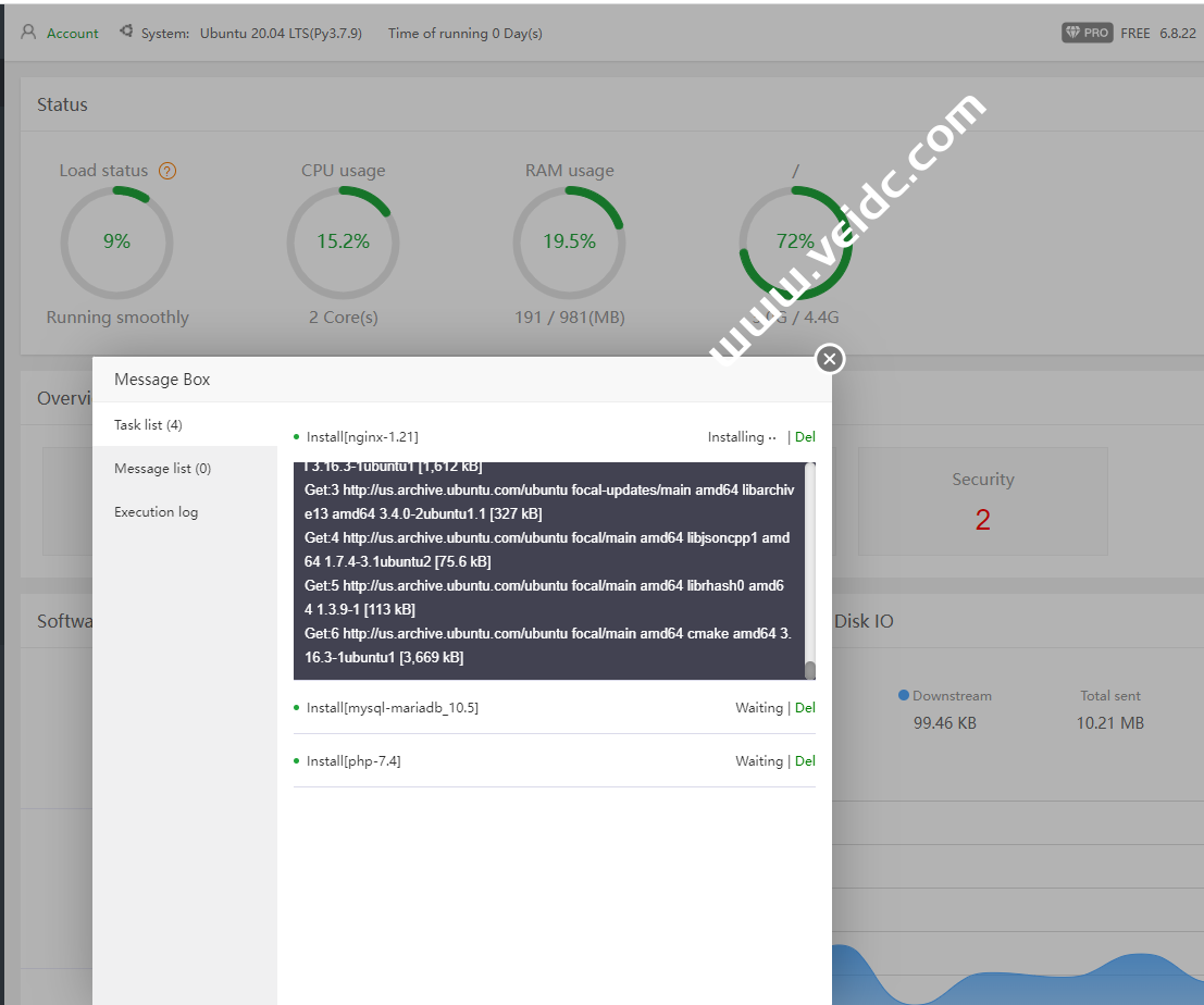 安装完成后,首页aaPanel 仪表板会显示您当前的服务器资源使用情况、流量、统计信息和用于配置服务器的控制面板工具。