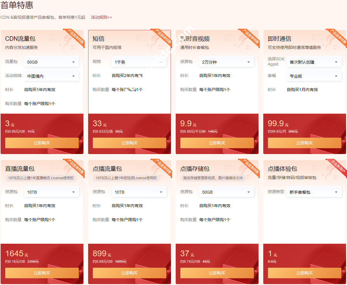 腾讯云CDN & 音视频通信会场 新春采购季,汇聚CDN、短信、TRTC、IM、云直播、云点播等多款爆款产品,短信 0.033元/条起,CDN 3元起,更多特惠套餐包0.7折起,腾讯云CDN&音视频通信免费资源限时领取,助力共抗疫情助力中小企业快速上云,部署音视频业务,提供 CDN/直播/点播/实时音视频/即时通信等资源免费领取和限时优惠。