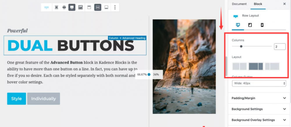 因为是左边有文字,右边有图。所以只需要设置为2栏。同时右侧的子栏目可以设置的窄一些。这里我们可以使用拖拽功能,控制 [Row Layout] 中每个子版块的宽度: