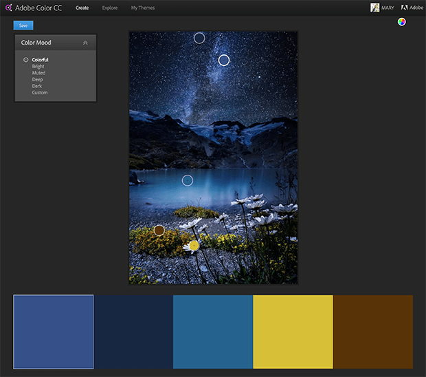 上传图片后,它会根据照片中的颜色自动为您创建配色方案,也可以移动选择并调整各个颜色。