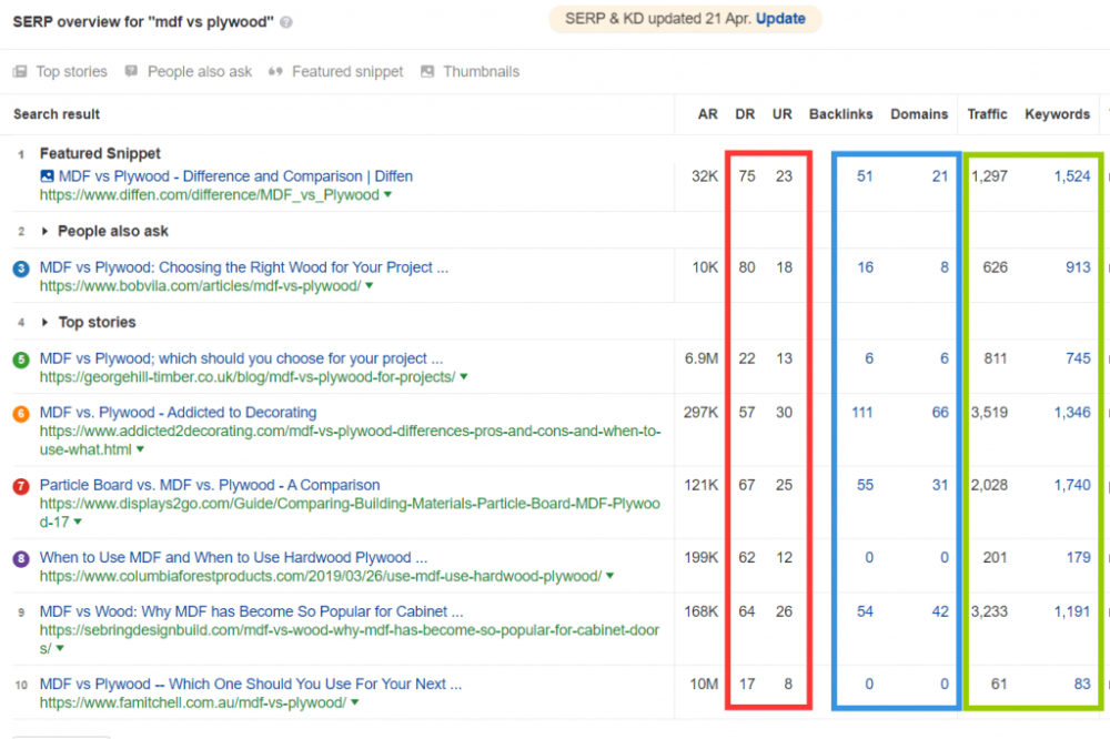 这时你就会发现不少可以做内容增值的地方。例如上图中我红色标记出的位置。你可以用一些段落+图片分别对 “mdf” 和 “plywood”进行定义;或者是针对它们的硬度进行对比+介绍等等。