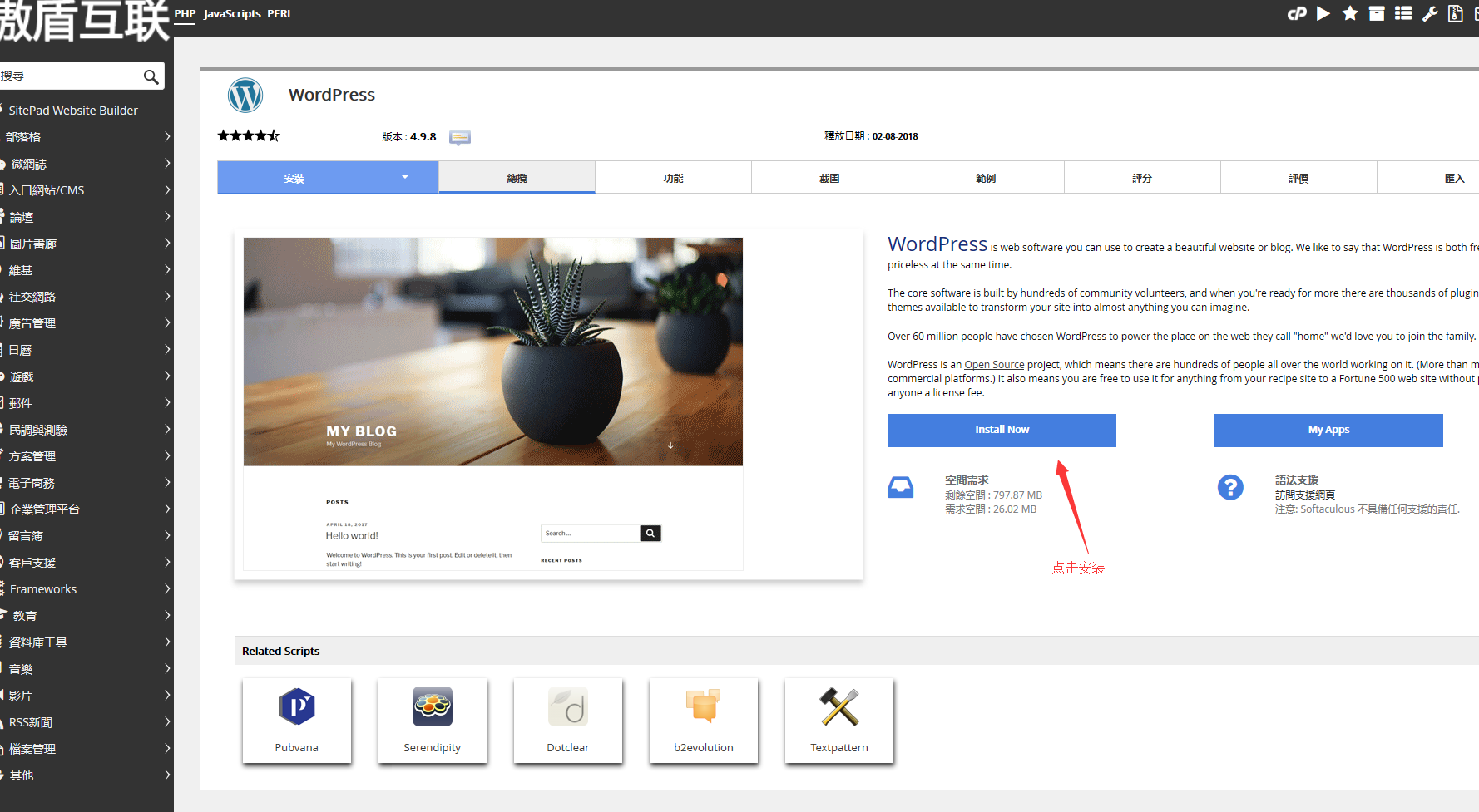 进入softaculous面板,点击安装