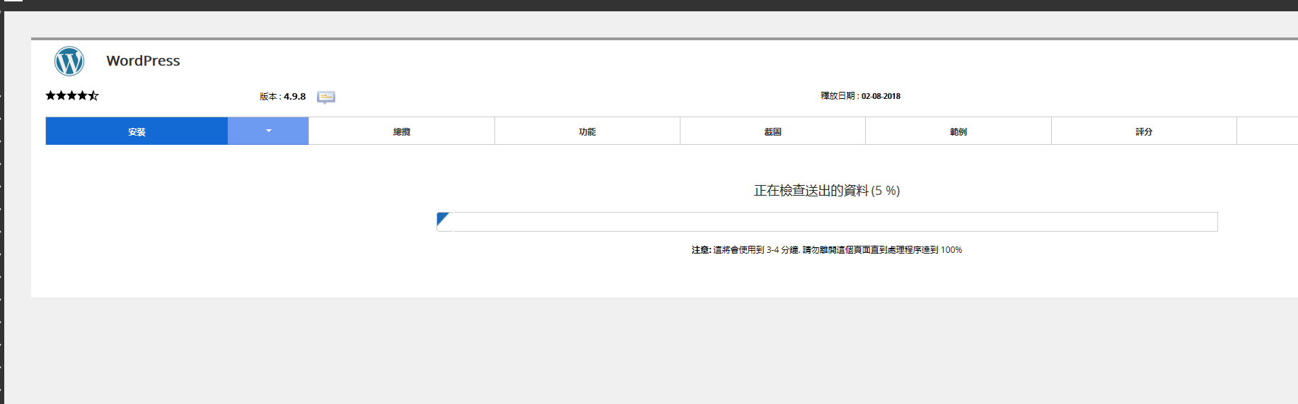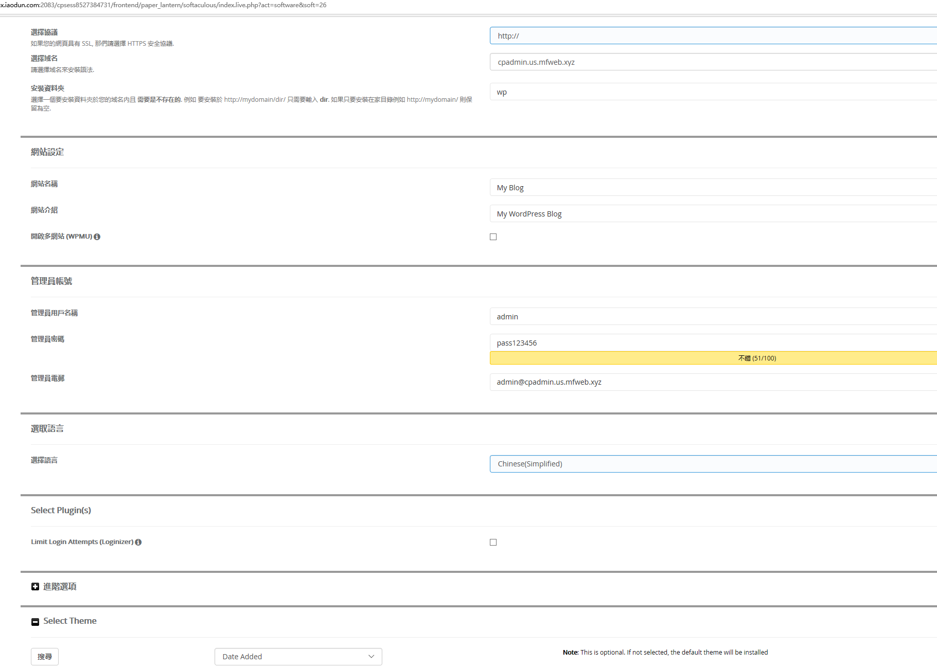 设置密码及一些参数,这里要注意安裝資料夾这个选项,通常安装是新建目录,如果您要安装到主目录,请清除wp的选项,然后下拉点击安装
