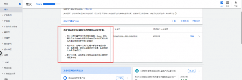 比如这个需要让我切换到转化价值出价我个人对这些建议并不是很看重,因为这个评分老实说与你的账户展示效果并无关联,只是一个针对账户设置的全不全的一个大致评测而已——千万不要将其与广告评级划等号。