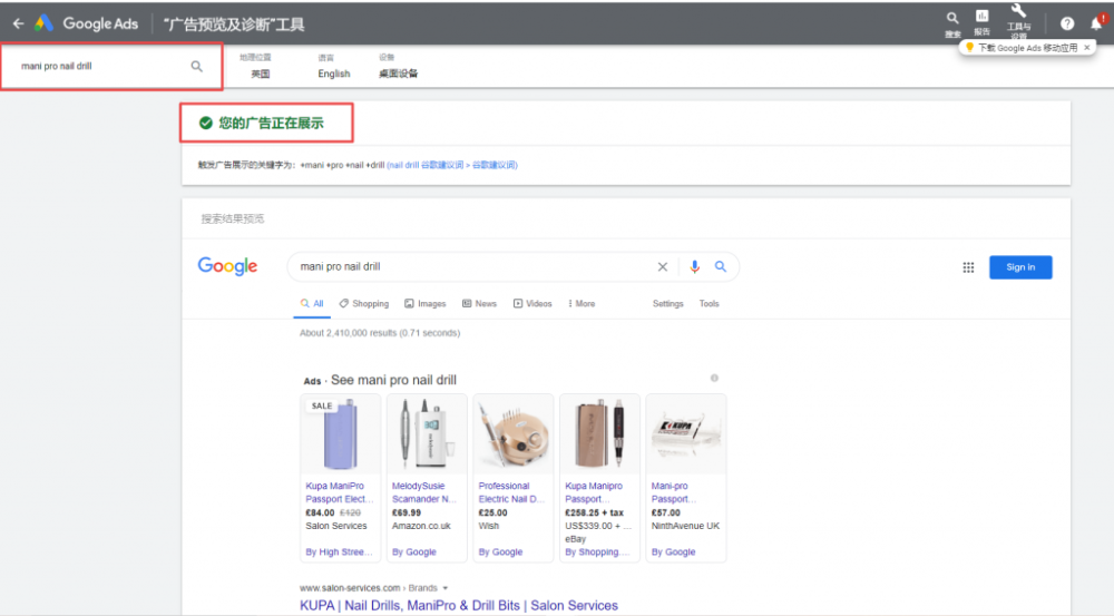 通过该工具可以很容易的查询到你的关键词和广告,是否在你设置的国家展示广告,以及触发广告的是哪个关键词。