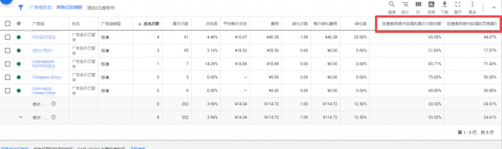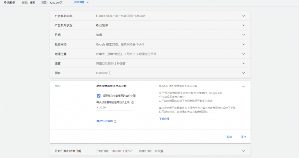 因为就算你的预算设置的比较高,但是关键词出价上限设置的较低,也不足以让你的广告有展示。一般谷歌会提示你的出价“受限”。这种情况比较容易出现在使用智能出价的时候(如争取更多点击)。