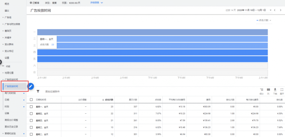 每个广告系列都可以设置具体的广告投放时间和地理展示位置。比如下方所示,广告只在周一到周五展示,那么你在周六日查看自己广告肯定是没有效果的。