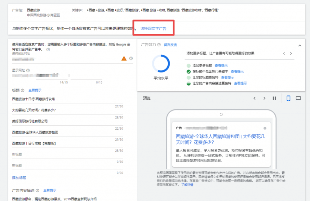 自适应搜索广告的灵活度要比文字广告高一些,但是注意了,灵活度高并不是指效果一定要比文字广告好。