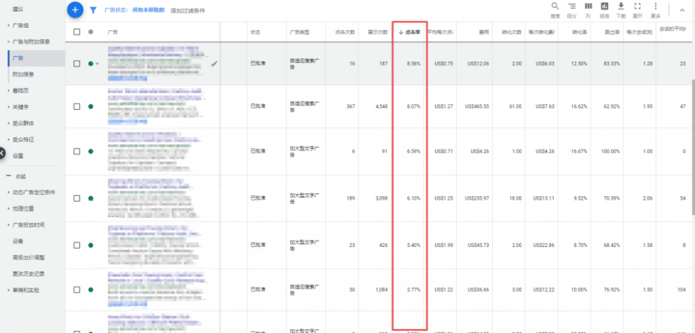 点击率:点击率是最能判断一个广告效果的数据,点击率越高说明广告的描述与用户的搜索意图就越符合。(那么为什么不看展示次数?这个问题我们留到下次解答)