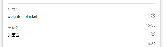 Tips:在Ads中,英文广告字的数量准确的说是字符,即一个字母或符号,如weighted blanket这个单词中一共包含了16个字符,15个字符加一个空格;而中文的广告,一个汉字算俩个字符,如加重毯这个词就是6个字符
