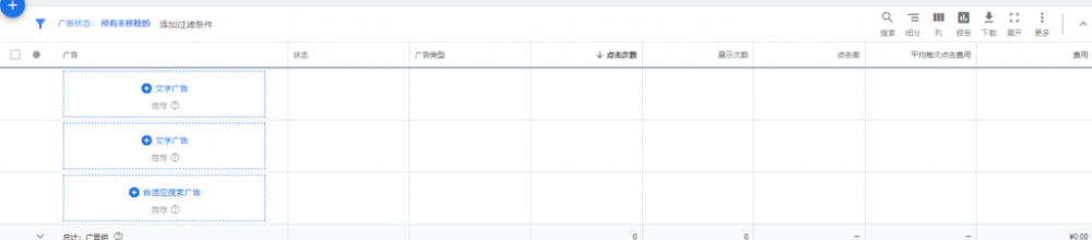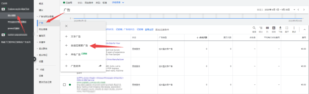创建自适应搜索广告有了俩种方法:与普通的文字广告一样,都是在广告层级进行创建。