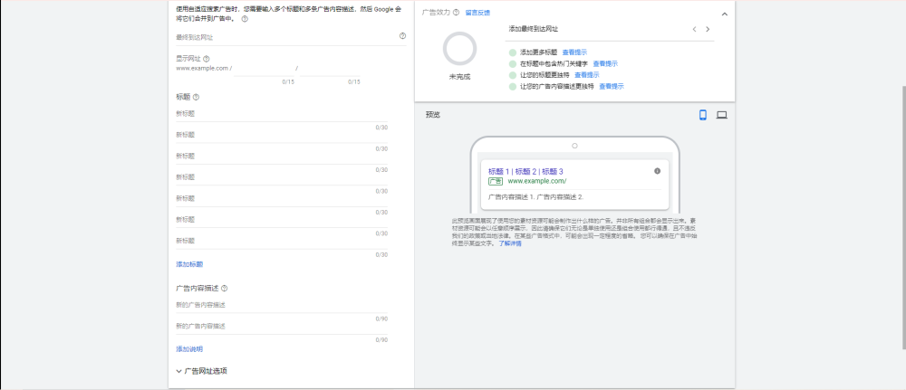 自适应搜索广告目前最多可以编写三个标题,每个标题不超过30个字符;一个显示网址(包含俩个最多15个字符的路径)和以及4个最多90个字符的广告描述。