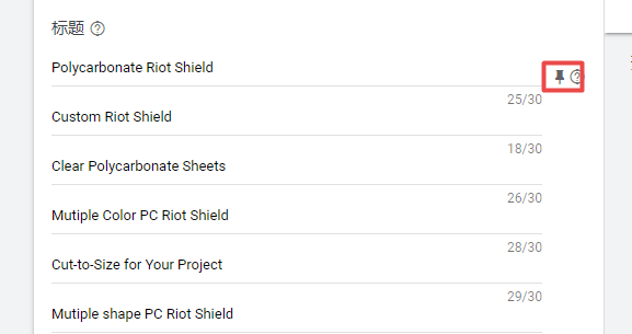 自适应搜索广告还有一个固定功能,在标题和广告描述后面会有一个固定标识,点击后,该标题或描述就可以有选择性的固定在广告的特定位置上。