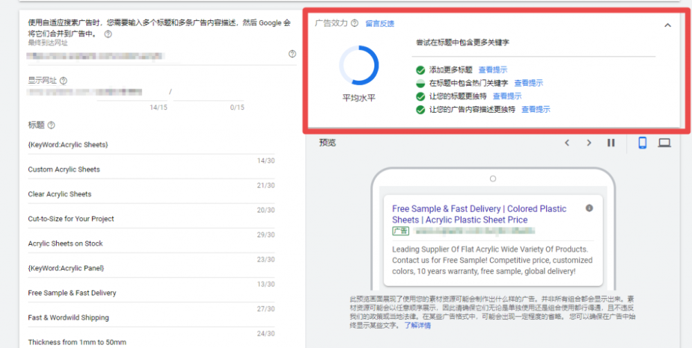 编写完RSA后,你可以在操作界面的右上角看到“广告效力”这一数值,其含义就是根据你的广告内容,自适应搜索广告会给出一个相对大众化的评分,你可以根据广告效力的评分和提示进行修改。