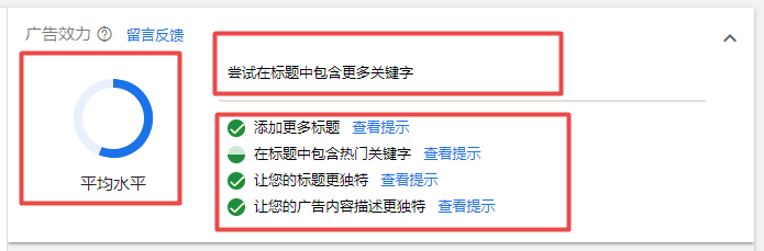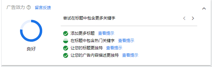 Tips:广告效力并非是一个绝对化的标准,更多的是Ads的一个规范——只要你的广告标题包含的关键词足够全,写的字符足够多就可以达成广告效力良好的评分。但实际上我们依然要以广告的具体数据(如展示份额,点击率等)为核心导向。