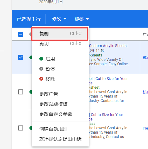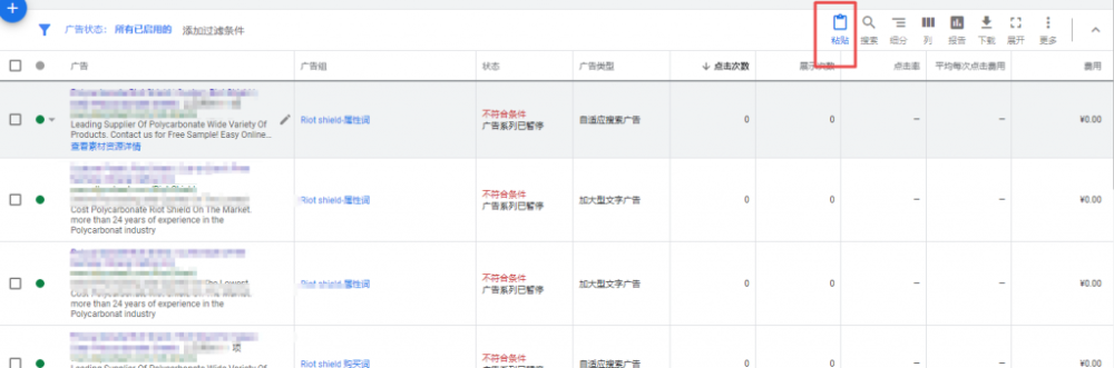 我们在搭建广告系列的框架时,我们会根据相关性和关键词的词性进行分组,因此很多时候广告组设置的会比较多,但是很多不同组的词是对应的是同一个着陆页。如果每个广告组都要写一个自适应广告通常是一个很麻烦的事情,那么这里我们其实只需复制一个自适应搜索广告,并粘贴到其他的广告组中就好了。