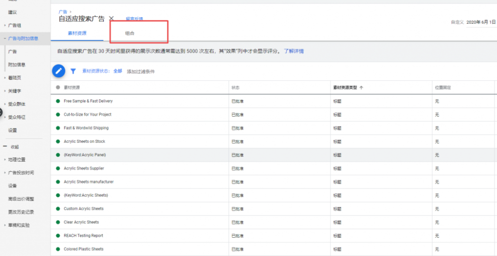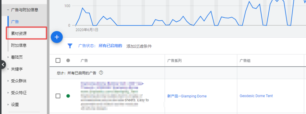 由于自适应搜索广告是根据用户的搜索词等自动匹配我们的“素材”,并形成广告,那么我们想要优化自适应搜索广告的素材的话该怎么办呢?其实也不难,只需要查看我们的“素材资源”就可以了