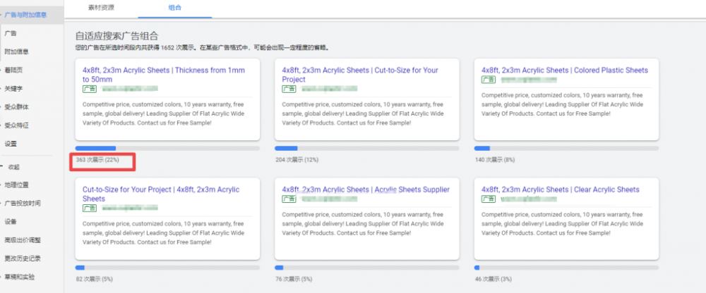 在组合里我们可以和能清晰的看到:各种组合的自适应搜索广告,和其展示次数及展示所占比例,通过这些数据,我们可以较确切的分析出:用户更加偏向喜欢哪些广告类型,如是数据描述型或是产品推荐型等等,我们也就可以针对性的修改这些组内的RSA。