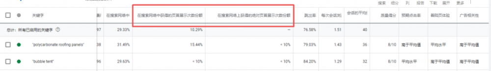 除了通过调整广告内容增加相关性外,预算和出价往往也会限制广告效果,这是因为谷歌为了满足账户跑完一天的预算,往往会导致的广告展示位置偏低。这里我们可以通过分析广告投放后的页首展示份额来判断。因此,初期你需要每天关注展示份额和展示百分比。