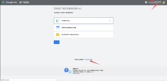 注意:此处非常关键,很多人第一次直接点了下一步,那你就必须一步一步按照谷歌要求来设置账户了,包括关键词,广告和结算信息等,第一次使用的能被烦死。