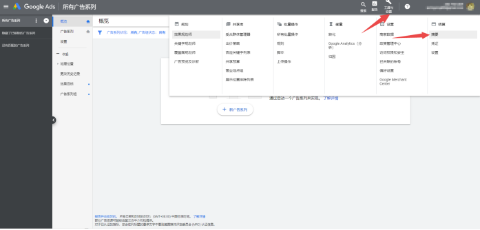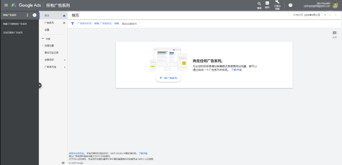 第一次进入该账号时,里面是光秃秃一片,毛都没有。但是这里我们先不着急设置广告系列 ,我们要先开通结算方式(可以先不用充值),只有开通了结算方式,你的账号才能投放广告。
