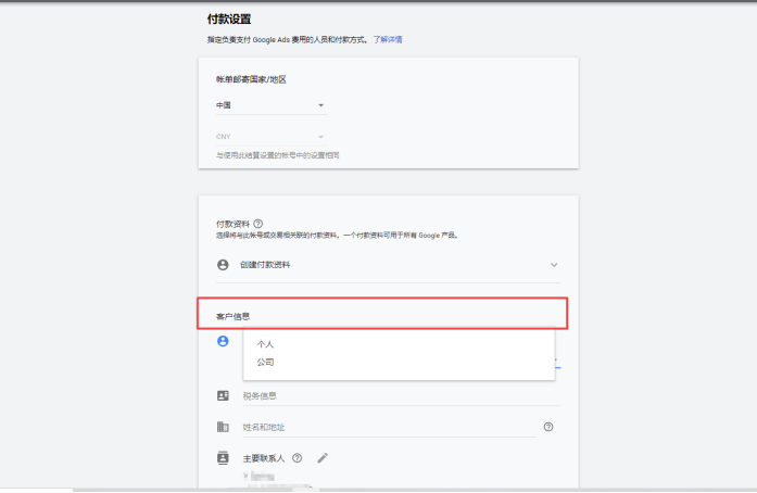 第一个设置的是选择你的客户信息,也就是我们开篇说的账户身份,是作为个人账户还是公司账户,俩者就Ads的界面操作而言并没有区别,但是在一些比较敏感的产品上,公司要具有一些优势。