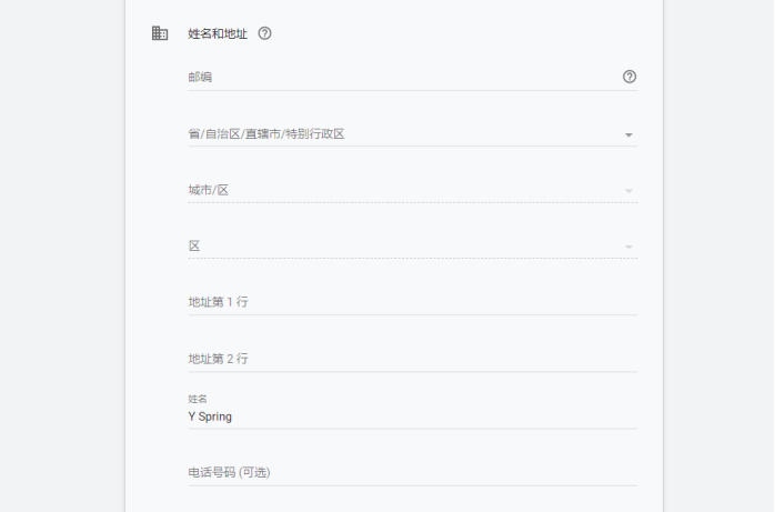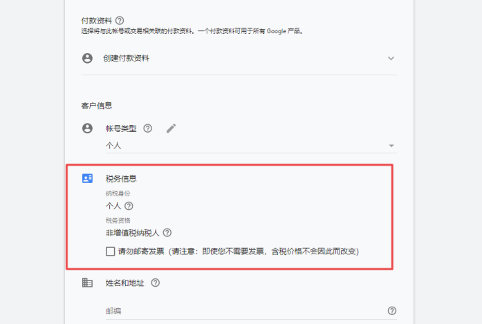 个人账户的设置比较简单,不需要追溯你是干啥的,只要你给钱就行,非常适合独立站长或是代销拿提成的用户。对于个人用户来说,税务信息也不是很重要,可以选择不需要发票,只要按要求填写好姓名和地址等信息就可以(甚至地址随便填个地方也可以)。