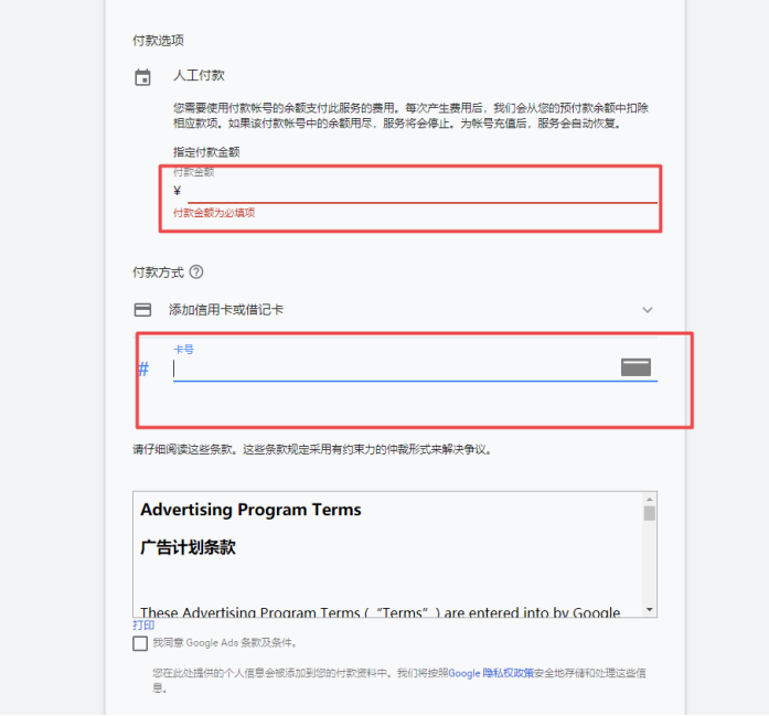 人工充值是你预先充值一定的金额,然后在广告投放中消耗掉,这样比较容易控制预算而且可随时充值;而自动充值则是绑定你的信用卡,在投放费用产生之后自动从卡中支付。我个人偏向人工付款,灵活度较高且我不喜欢绑定账户(与封号有关)。
