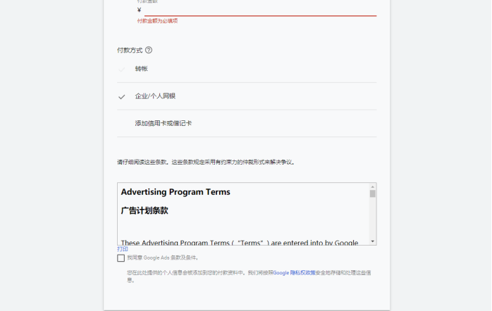 国内的付款方式有三种,我推荐使用“企业/个人网银”,这种方式最方便,同时可以控制每次充值的费用。