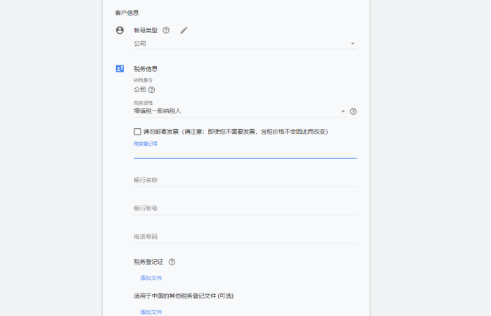 你需要提交一些税务信息给谷歌Ads官方认证。税务登记号啥的不知道就找你们财务去要,还需要一个电子版的三证一码上传就可以了。其他的与个人账户一样设置就行。