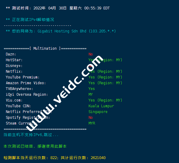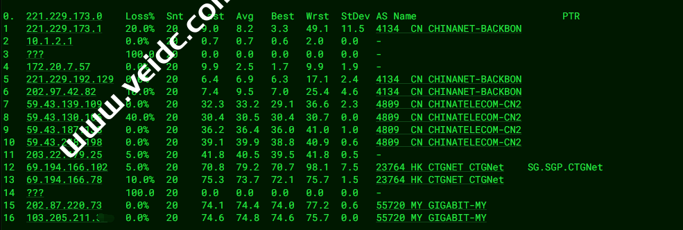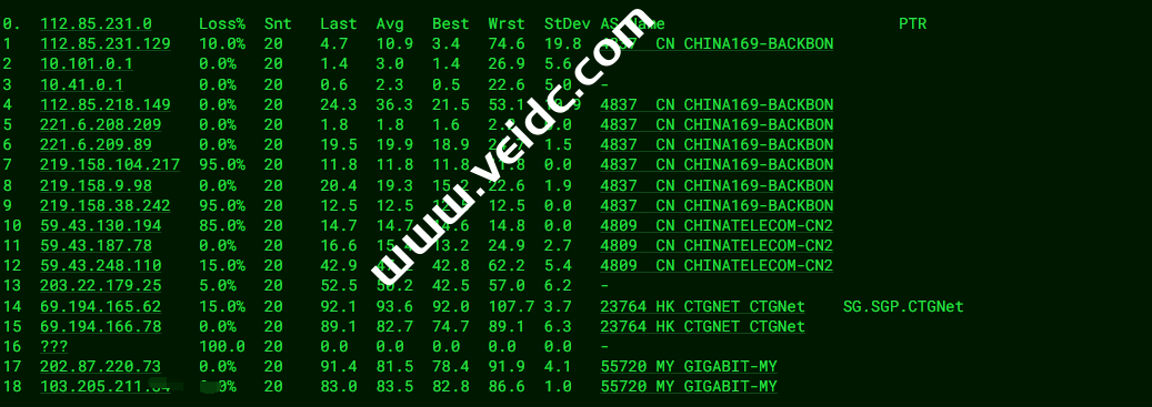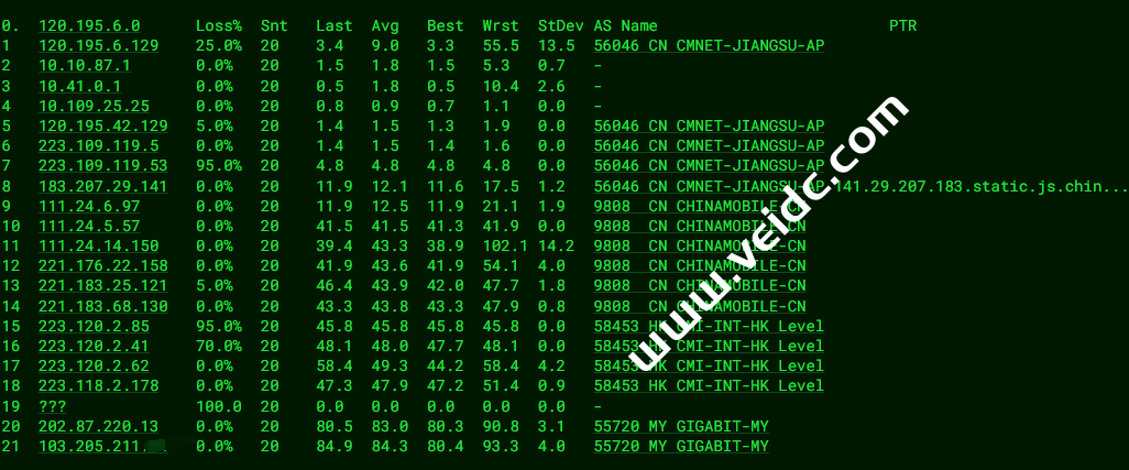 [Info] 测试路由 到 上海电信(天翼云) 中 ... traceroute to 101.227.255.45 (101.227.255.45), 30 hops max, 32 byte packets 1 202.87.223.2 1.63 ms AS55720 马来西亚, 吉隆坡联邦直辖区, thegigabit.com 2 * 3 121.59.124.21 8.19 ms AS23764 新加坡, chinatelecom.com.cn, 电信 4 69.194.166.13 7.32 ms AS23764 新加坡, chinatelecom.com.cn, 电信 5 CN.HKG.CTGNet (69.194.165.37) 40.15 ms AS23764 中国, 香港, chinatelecom.com.cn, 电信 6 203.22.178.34 41.92 ms * 中国, 香港, chinatelecom.com.cn, 电信 7 59.43.248.206 68.62 ms * 中国, 上海, chinatelecom.com.cn, 电信 8 59.43.187.69 68.26 ms * 中国, 上海, chinatelecom.com.cn, 电信 9 * 10 101.95.88.18 71.44 ms AS4812 中国, 上海, chinatelecom.com.cn, 电信 11 101.95.207.242 68.90 ms AS4812 中国, 上海, chinatelecom.com.cn, 电信 12 * 13 * 14 * 15 * 16 * 17 * 18 * 19 * 20 * 21 * 22 * 23 * 24 * 25 * 26 * 27 * 28 * 29 * 30 * [Info] 测试路由 到 上海电信(天翼云) 完成 ! [Info] 测试路由 到 厦门电信CN2 中 ... traceroute to 117.28.254.129 (117.28.254.129), 30 hops max, 32 byte packets 1 202.87.223.2 1.19 ms AS55720 马来西亚, 吉隆坡联邦直辖区, thegigabit.com 2 * 3 121.59.124.21 7.56 ms AS23764 新加坡, chinatelecom.com.cn, 电信 4 69.194.165.177 7.02 ms AS23764 新加坡, chinatelecom.com.cn, 电信 5 CN.HKG.CTGNet (69.194.166.89) 40.19 ms AS23764 中国, 香港, chinatelecom.com.cn, 电信 6 203.22.178.30 40.04 ms * 中国, 香港, chinatelecom.com.cn, 电信 7 * 8 * 9 59.43.130.121 48.98 ms * 中国, 广东, 广州, chinatelecom.com.cn, 电信 10 59.43.46.214 83.57 ms * 中国, 福建, chinatelecom.com.cn, 电信 11 110.80.128.94 78.92 ms AS133775 中国, 福建, 厦门, chinatelecom.com.cn, 电信 12 27.148.195.2 81.29 ms AS133775 中国, 福建, 厦门, chinatelecom.com.cn, 电信 13 117.25.141.110 73.33 ms AS133775 中国, 福建, 厦门, chinatelecom.com.cn, 电信 14 117.28.254.129 63.78 ms AS4809 中国, 福建, 厦门, chinatelecom.com.cn, 电信 [Info] 测试路由 到 厦门电信CN2 完成 ! [Info] 测试路由 到 浙江杭州联通 中 ... traceroute to 101.71.241.238 (101.71.241.238), 30 hops max, 32 byte packets 1 202.87.223.2 1.27 ms AS55720 马来西亚, 吉隆坡联邦直辖区, thegigabit.com 2 * 3 202.77.19.169 75.67 ms AS10099 中国, 香港, chinaunicom.com, 联通 4 202.77.18.194 56.93 ms AS10099 中国, 香港, chinaunicom.com, 联通 5 202.77.23.25 60.98 ms AS10099 中国, 香港, chinaunicom.com, 联通 6 219.158.10.53 94.06 ms AS4837 中国, 广东, 广州, chinaunicom.com, 联通 7 219.158.96.206 61.74 ms AS4837 中国, 广东, 广州, chinaunicom.com, 联通 8 219.158.8.117 57.71 ms AS4837 中国, 广东, 广州, chinaunicom.com, 联通 9 219.158.106.70 77.74 ms AS4837 中国, 浙江, 杭州, chinaunicom.com, 联通 10 101.69.245.206 86.15 ms AS4837 中国, 浙江, 杭州, chinaunicom.com, 联通 11 * 12 * 13 * 14 * 15 * 16 * 17 * 18 * 19 * 20 * 21 * 22 * 23 * 24 * 25 * 26 * 27 * 28 * 29 * 30 * [Info] 测试路由 到 浙江杭州联通 完成 ! [Info] 测试路由 到 浙江杭州移动 中 ... traceroute to 112.17.0.106 (112.17.0.106), 30 hops max, 32 byte packets 1 202.87.223.2 1.07 ms AS55720 马来西亚, 吉隆坡联邦直辖区, thegigabit.com 2 * 3 103.106.248.5 34.18 ms * 马来西亚, 1maxhosting.com 4 223.118.2.177 33.36 ms AS58453 中国, 香港, chinamobile.com, 移动 5 221.183.21.1 40.30 ms AS9808 中国, 香港, chinamobile.com, 移动 6 221.176.24.57 39.64 ms AS9808 中国, 广东, 广州, chinamobile.com, 移动 7 221.176.22.233 40.03 ms AS9808 中国, 广东, 广州, chinamobile.com, 移动 8 111.24.5.181 52.91 ms AS9808 中国, 广东, 广州, chinamobile.com, 移动 9 221.183.111.89 66.70 ms AS9808 中国, 浙江, 杭州, chinamobile.com, 移动 10 * 11 211.138.119.54 68.25 ms AS56041 中国, 浙江, 杭州, chinamobile.com, 移动 12 * 13 * 14 * 15 * 16 * 17 * 18 * 19 * 20 * 21 * 22 * 23 * 24 * 25 * 26 * 27 * 28 * 29 * 30 * [Info] 测试路由 到 浙江杭州移动 完成 ! [Info] 测试路由 到 北京教育网 中 ... traceroute to 202.205.6.30 (202.205.6.30), 30 hops max, 32 byte packets 1 202.87.223.2 11.06 ms AS55720 马来西亚, 吉隆坡联邦直辖区, thegigabit.com 2 * 3 cjb-r3-a73.time.net.my (203.121.81.73) 1.41 ms AS9930 马来西亚, time.com.my 4 223.28.35.230 1.52 ms AS9930 马来西亚, 吉隆坡联邦直辖区, time.com.my 5 * 6 * 7 223.28.43.66 7.36 ms AS9930 新加坡, time.com.my 8 223.28.47.181 6.73 ms AS9930 马来西亚, 柔佛州, time.com.my 9 223.28.43.254 40.99 ms AS9930 中国, 香港, time.com.my 10 multidata1-10g.hkix.net (123.255.91.118) 79.90 ms * 中国, 香港, hkix.net 11 101.4.114.181 80.50 ms AS4538 中国, 北京, edu.cn, 教育网 12 * 13 * 14 101.4.118.213 80.00 ms AS4538 中国, 北京, edu.cn, 教育网 15 101.4.113.110 80.87 ms AS4538 中国, 北京, edu.cn, 教育网 16 219.224.102.230 79.50 ms AS4538 中国, 北京, edu.cn, 教育网 17 * 18 * 19 * 20 * 21 * 22 * 23 * 24 * 25 * 26 * 27 * 28 * 29 * 30 * [Info] 测试路由 到 北京教育网 完成 ! [Info] 四网路由快速测试 已完成 !