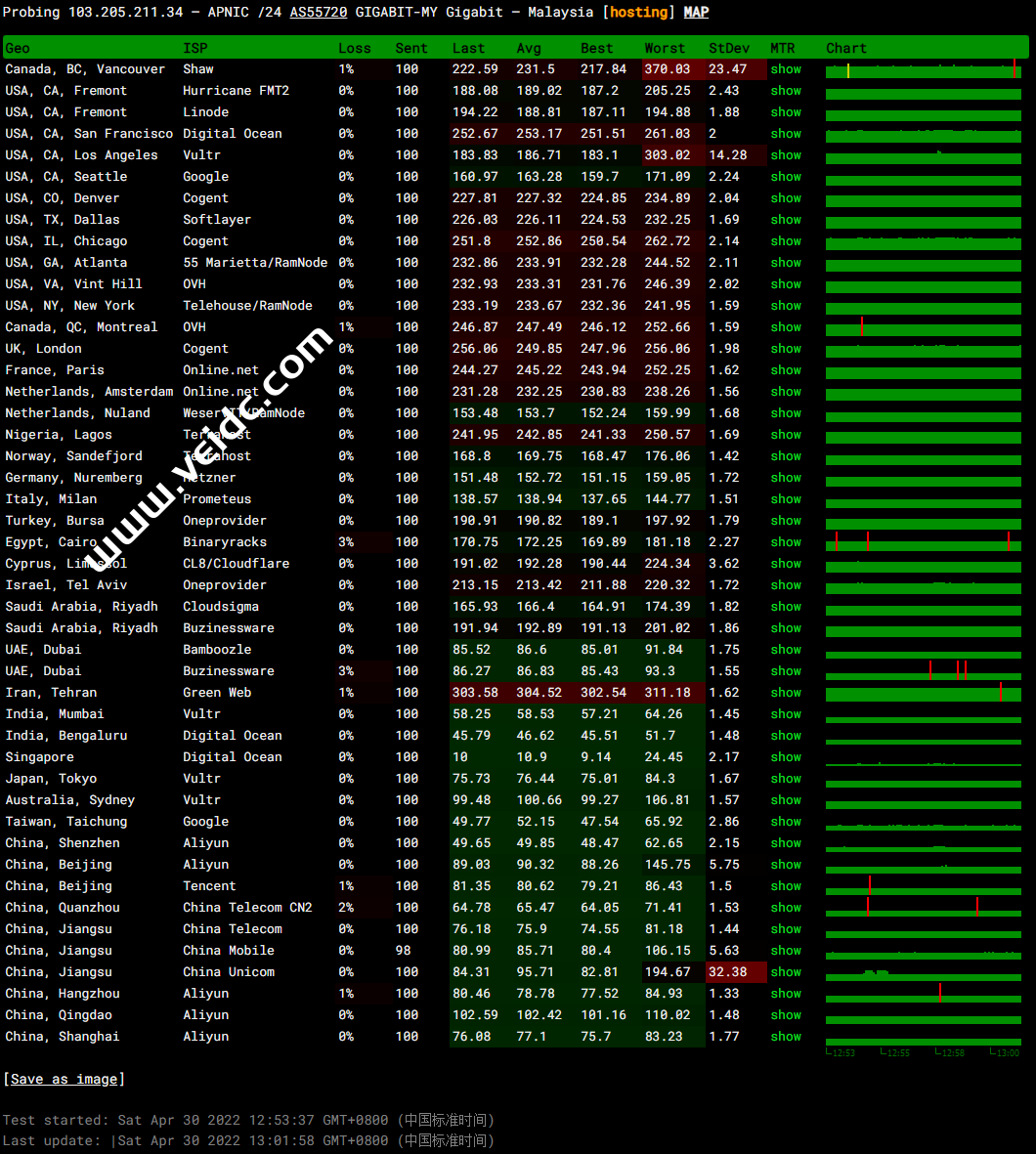全球PING及丢包率测试:
