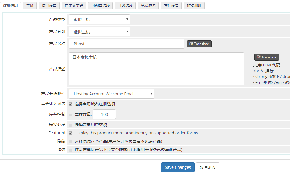 新产品添加页面,主要有定价、接口设置、升级选项、免费域名、链接地址等等。(点击放大)
