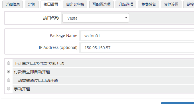 如何对接?主要是在接口处设置。接口名称选择VestaCP,套餐名称填写你刚刚在VestaCP的预设套餐名称,必须一致,注意大小写!开通可以选择审核还是自动开通。