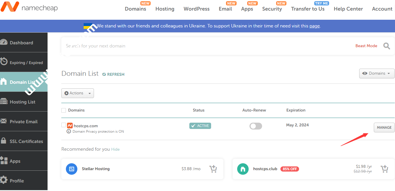 在域名列表中,找到需要解析的网站域名,点击右侧的按钮【manage】,进入域名管理界面;
