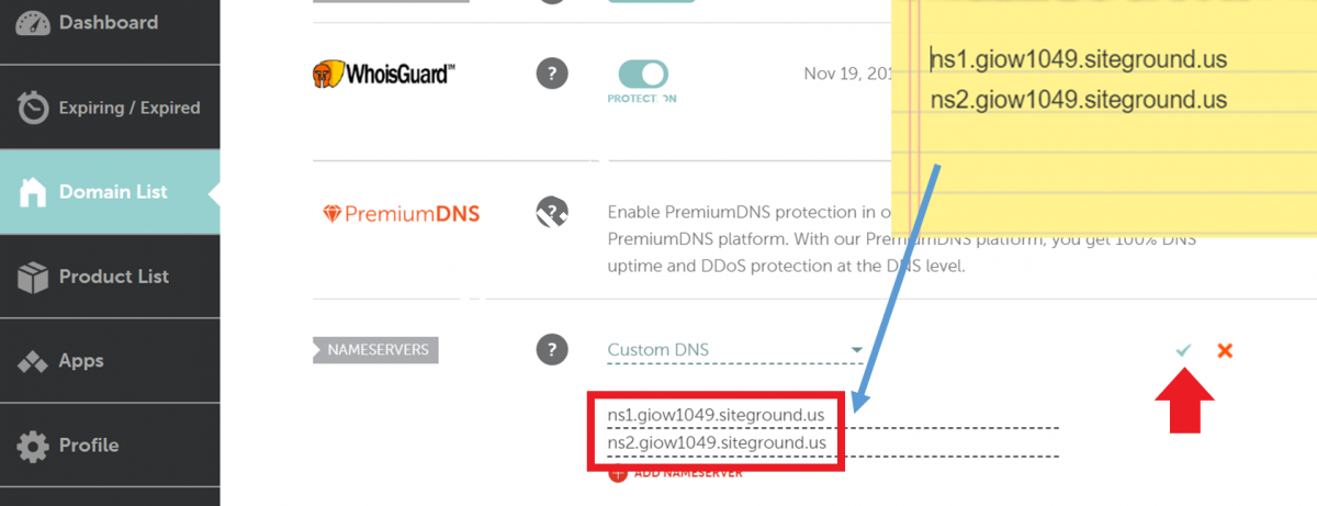 将cloudflare或SiteGround主机DNS,复制到下面的两行中,注意一行填写一个地址;复制完成后,请点击绿色的【对号】保存即可。