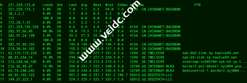 电信去程,骨干网对接telia到inap机房: