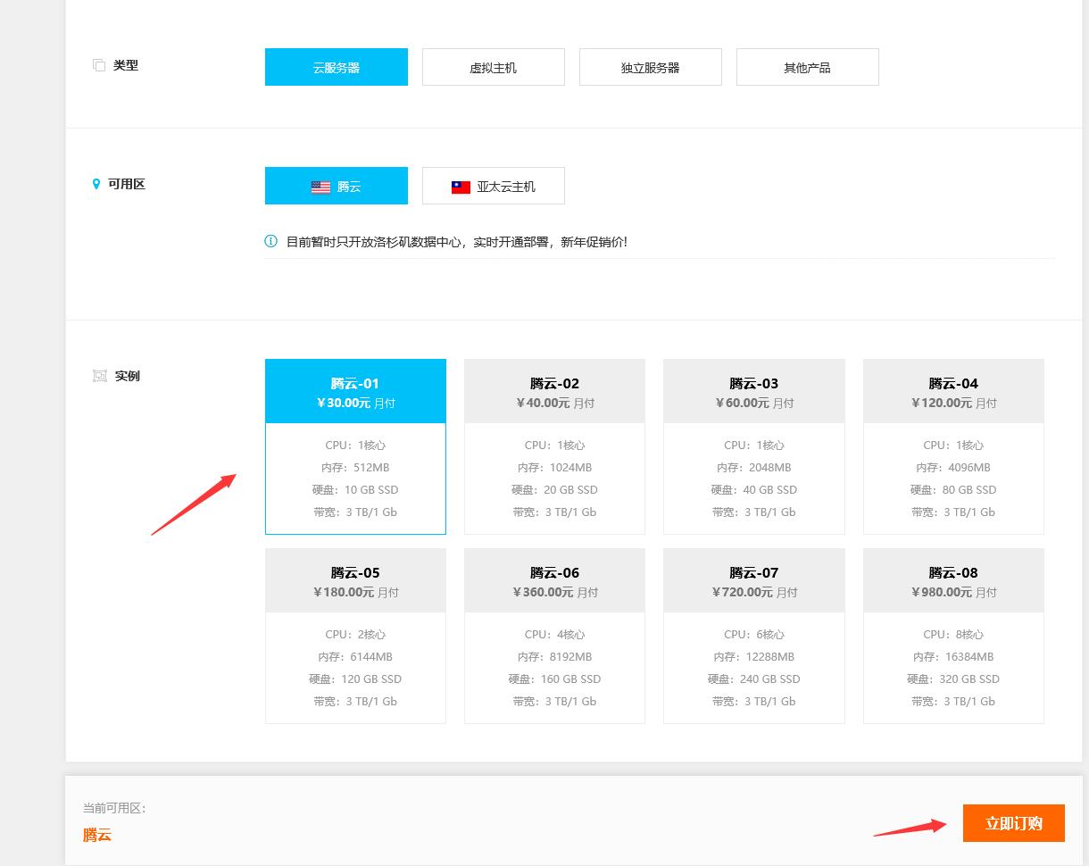 大道至简,简单的云才是最好的云。我们秉承一切从简、客户体验至上的理念。全新推出了腾云系列云主机,该系列主机采用G口带宽,无论型号流量均为3TB。且价格低至30元每月。数据中心位于美国洛杉矶,延迟低,访问速度快,非常适合国内用户和外贸企业使用。下面介绍一下开通流程,非常简单。