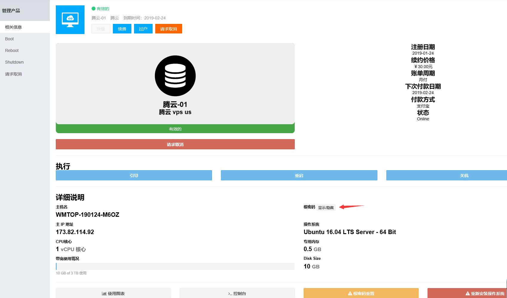 然后返回用户中心,在产品服务中,可以看到刚刚订购成功的云主机。点击管理,进入控制面板。