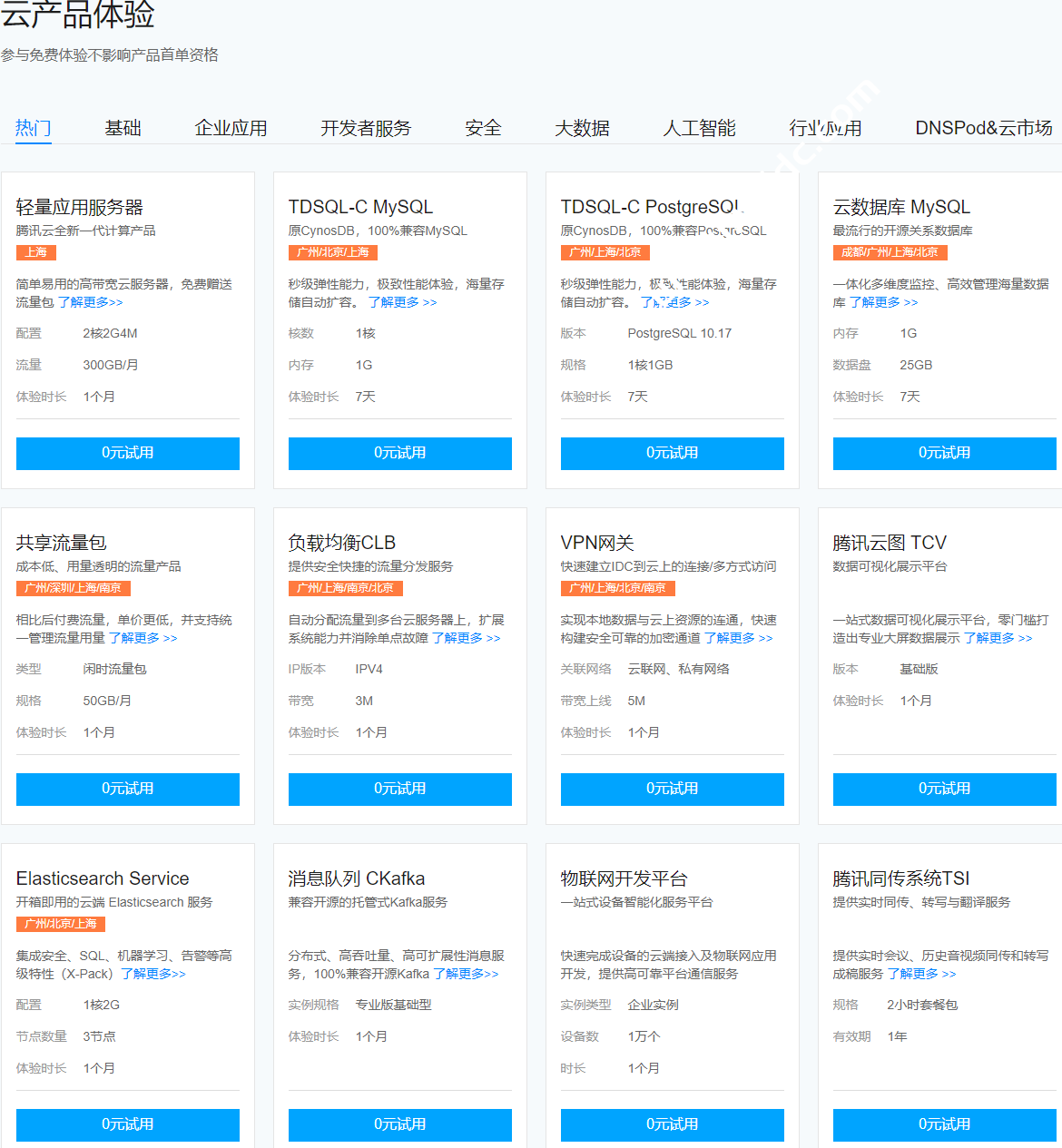 如图所示,可以看到包括轻量应用服务器、TDSQL-C MySQL、TDSQL-C PostgreSQL、云数据库 MySQL、共享流量包、负载均衡 CLB 等各种云产品都可以免费使用,也就是 0 元试用。