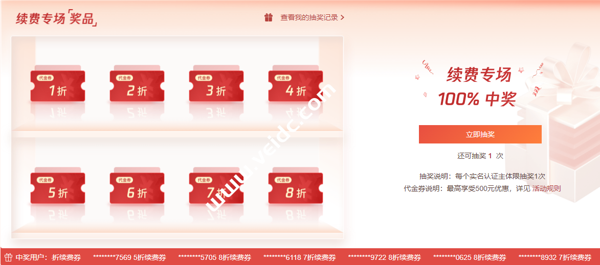 腾讯云 5 月份的续费专场来了,双重福利大放送,云服务器续费最高可以享受 1 折优惠。其实是需要自己抽奖,抽到几折就是几折,每个实名认证主题可以抽奖一次,意思应该是自己注册多个账户也只能抽奖一次吧,不过小编实测了一下多个账户每个账户都可以抽奖一次,但是我抽到的好像都是 8 折。