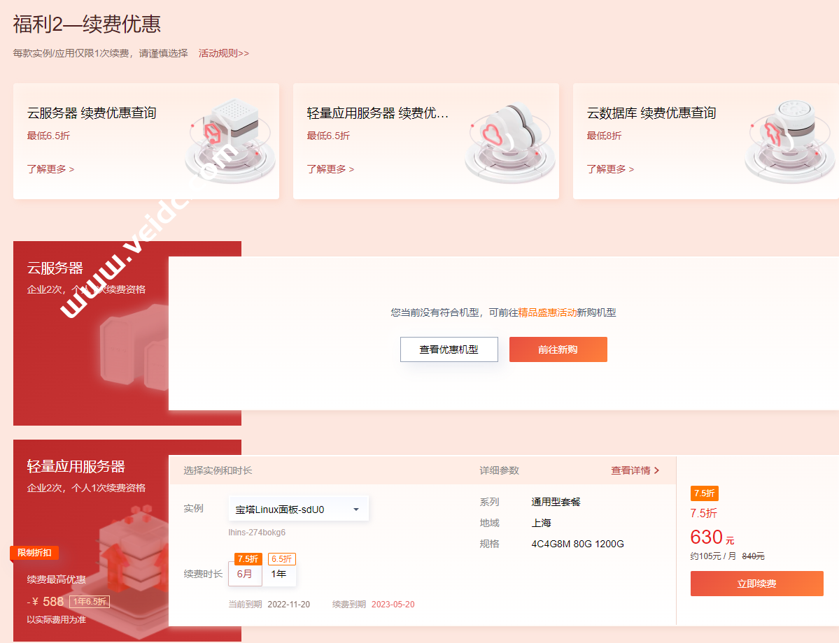 然后是续费优惠,直接可以享受优惠,云服务器是 6.5 折,轻量应用服务器也是 6.5 折,最多都只能续费一年。