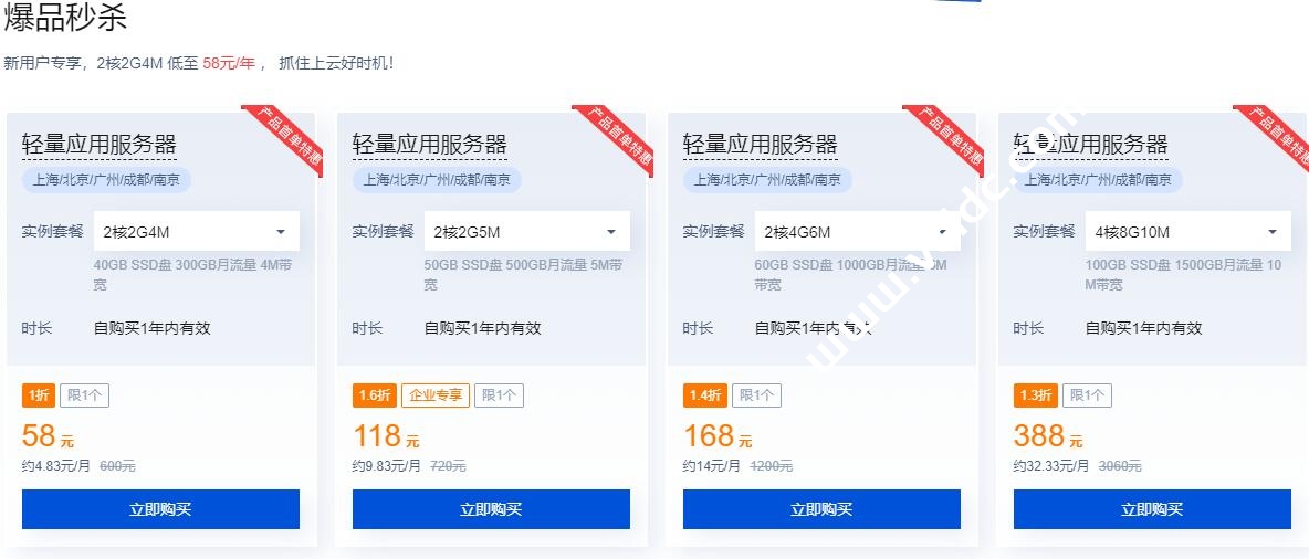 首先是爆品秒杀,有一些大陆地区的轻量应用服务器秒杀,包括上海、北京、广州、成都、南京等地区。